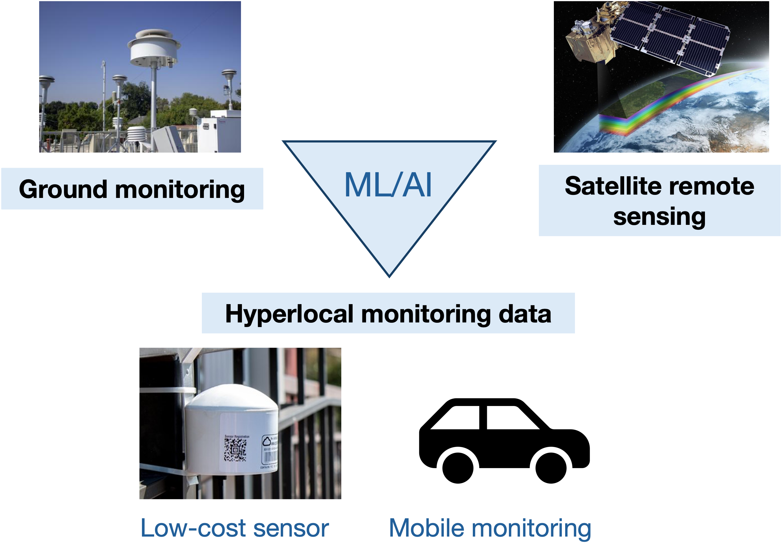 We aim to predict air pollution concentration at high spatial-temporal resolution using data from satellite remote sensing, low-cost sensors, and other sources. Data from multiple sources can provide better spatial and temporal coverage at fine scales. The fine-scale pollution mapping can better quantify human exposure to ambient air pollution.