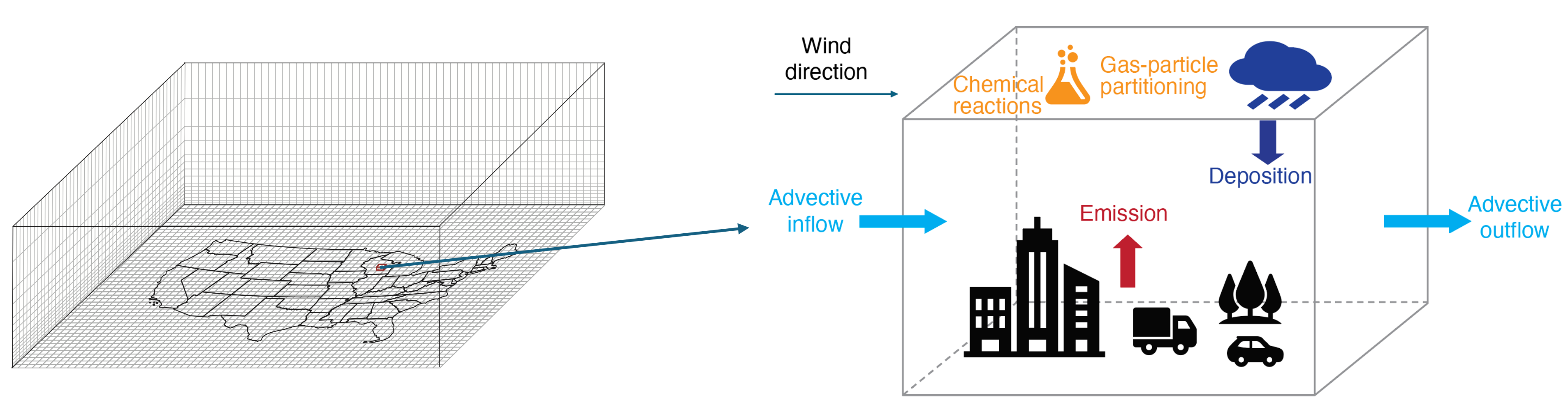 We develop both conventional numerical models (e.g., CMAQ) and reduced-complexity models to predict air pollution concentrations from emissions. For comprehensive photochemical models, we add new chemical mechanisms to model new species. We also use data-driven approaches to develop reduced-complexity models, which are computationally efficient, to assist scenario analysis and solution optimization better. Additionally, we incorporate machine learning techniques to reduce the biases in models and emission inventories. The new models can be used to quantify source contributions, air transport, and health burdens from emissions.
